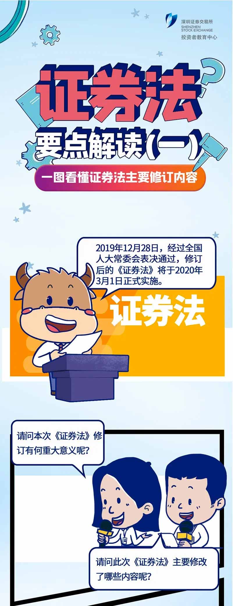 為進一步做好《證券法》的普及宣傳,增強投資者自我保護能力,引導投資者更好知法、懂法、守法,深交所投教中心推出過“《證券法》要點解讀”系列投教產品。它以漫畫形式生動簡明地解讀了五大內容:主要修訂內容、投資者保護主要內容、信息披露專章、證券交易專章及證券交易所的新變化。